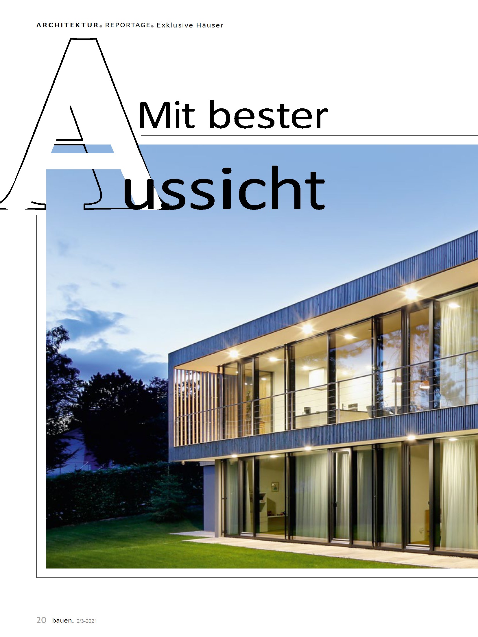 Dieser Artikel beschreibt den Bau einer Luxusvilla auf einem Grundstück mit Blick über das Tal und den Erhalt des alten Baumbestandes. Der Architekt Oliver Müller und der Bauherr haben sich bemüht, die Bäume zu erhalten und die schöne Aussicht in die Planung des Hauses mit aufzunehmen. Da für das Grundstück kein Bebauungsplan vorhanden war, konnten Architekt und Bauherr ihre Vorstellungen individuell aushandeln und ihre gewünschte Platzierung des Hauses auf dem Grundstück sowie ein Flachdach realisieren. Die großen und offenen Wohnräume befinden sich auf der oberen Eingangsebene, um die Aussicht am schönsten zu genießen. Der Artikel enthält Informationen zur Lage und Grundrissanordnung des Hauses, sowie zur Auswahl von Baustoffen und zur Bauweise.