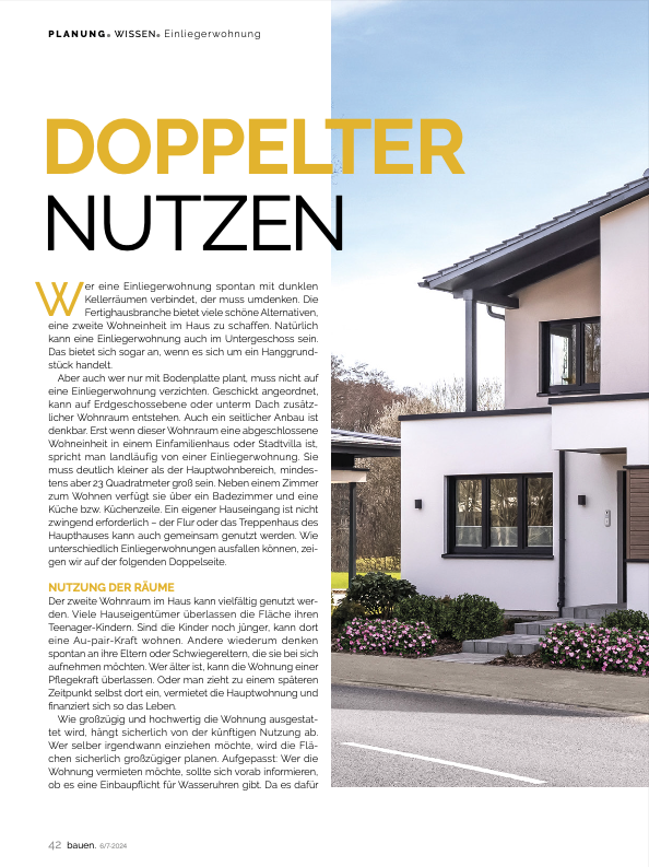Auf den Seiten 2, 3 und 4 des Artikels finden sich Informationen zum Thema Einliegerwohnungen. Auf Seite 3 wird beschrieben, dass Einliegerwohnungen eine Option sind, um beispielsweise Personen im Alter beistehen zu können. Einliegerwohnungen können ihre eigenen Eingänge haben und müssen nicht zwingend mit dem Haupthaus verbunden sein. Ein ausführlicher Mietvertrag kann helfen, das Zusammenleben unter einem Dach zu erleichtern. Auf Seite 2 wird eine nach vorn ausgerichtete Einliegerwohnung beschrieben, die über eine eigene Eingangstür verfügt. Auf Seite 4 wird eine großzügige Einliegerwohnung dargestellt, die das Hauptgebäude flankiert.