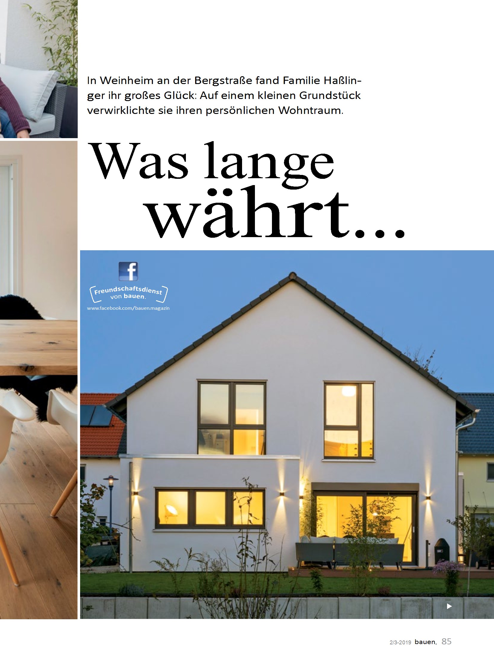 In dem Artikel „Fingerhaus-Edles Familienhaus-Stadthaus“ wird über das Hausbauprojekt von Christine und Oliver Haßlinger in Weinheim an der Bergstraße berichtet. Das Paar hat eine Baulücke in einem 15 Jahre alten Baugebiet erworben und durch den Fertighausanbieter Fingerhaus ein Hauskonzept mit kompakten Außenmaßen und viel Platz im Hausinneren umgesetzt. Die Aufteilung im Obergeschoss wurde individuell an die Wünsche der Haßlingers angepasst. Beim Innenausbau des Hauses haben sie ihre handwerkliche Begabung genutzt und viel selbst in Eigenleistung übernommen. Das Haus zeichnet sich durch eine harmonische Farb- und Materialgestaltung sowie moderne Technik aus. Ein besonderes Highlight sind große Glasschiebetüren, die den Essraum auf die vorgelagerte Terrasse erweitern und das Wohnen im Sommer bis in den Garten ausdehnen lassen. Die Seite 2 enthält eine kurze Zusammenfassung des Artikels und die Seite 6 enthält eine Werbeanzeige für Stommel Holzhäuser, die ebenfalls auf den Vorteilen von Holz als Baumaterial hinweist.