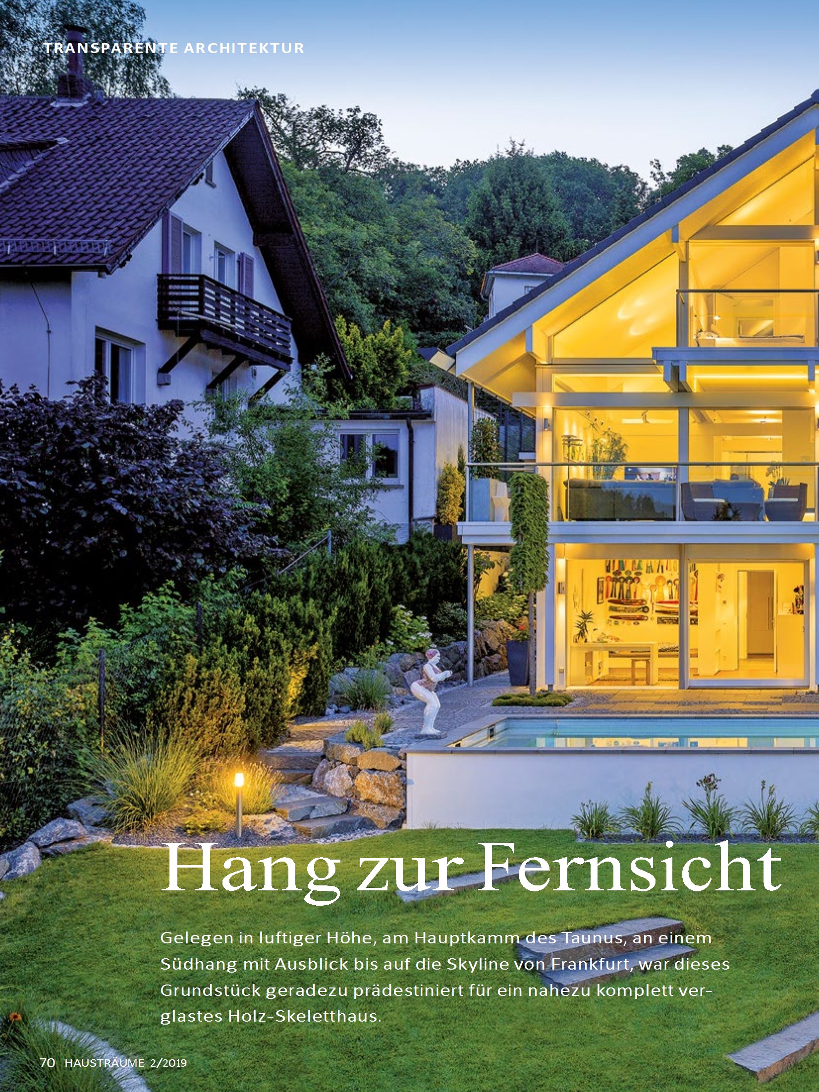 Das Huf Haus-Art 4-Stadthaus ist ein modernes und transparentes Haus mit einer Holzfachwerk-Konstruktion und großen verglasten Flächen, die einen herrlichen Blick auf die umliegende Natur und die Frankfurter Skyline bietet. Der Garten wurde von der Firma Garten-Art in fünf terrassierte Ebenen mit unterschiedlichen Funktionsbereichen angelegt. Die Außenanlagen verfügen über große Dachüberstände und Balkone, um die Fassade vor Schlagregen und Sonne zu schützen. Im Inneren sind die Räume offen und transparent mit fließenden Übergängen gestaltet. Der Wohnraum wird geprägt von dezent aufeinander abgestimmten Farben. Es gibt einen einladenden Pool und eine Wellness-Oase im Obergeschoss. Elmar Deichmann ist der Architekt des Projekts.