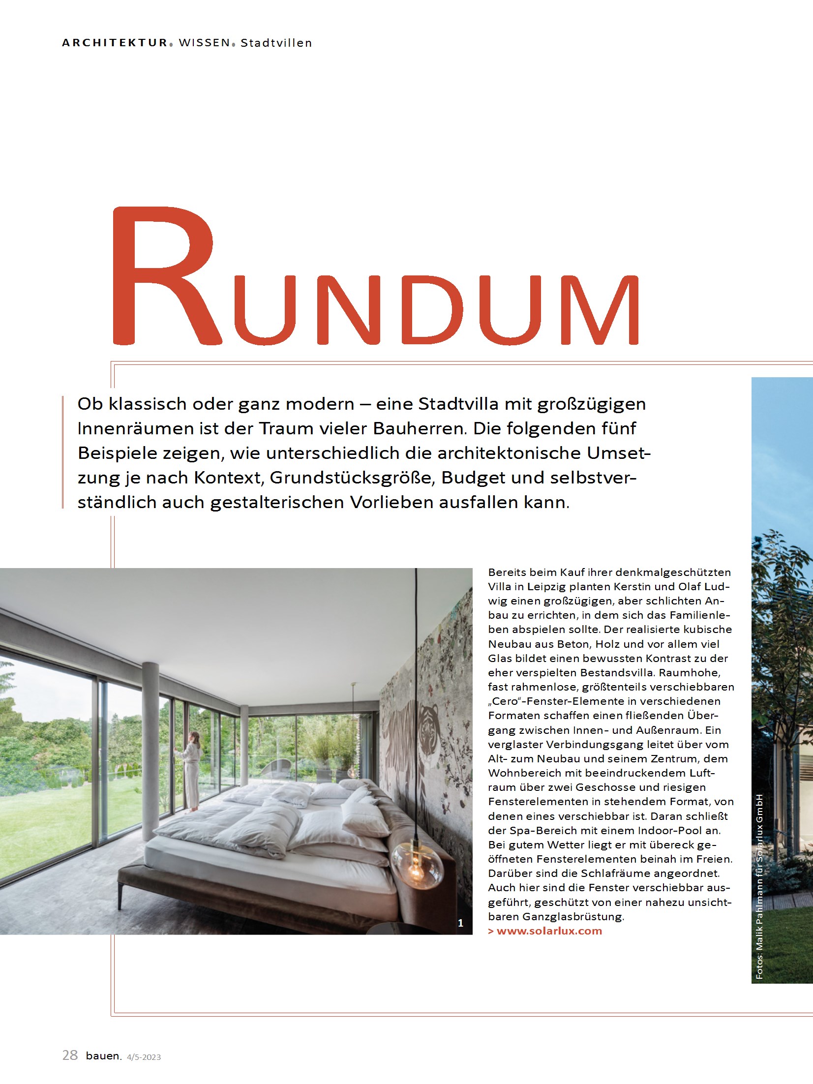 In dem Artikel geht es über fünf gelungene Stadtvillen, die aufgrund ihrer Architektur, der Grundstücksgröße, des Budgets und der gestalterischen Vorlieben der Eigentümer sehr unterschiedlich ausfallen. Die einzelnen Villen werden auf den Seiten zwei bis fünf beschrieben und mit Bildern vorgestellt. Auf der ersten Seite gibt es eine kurze Einführung, die den modernen Neubau einer denkmalgeschützten Villa in Leipzig beschreibt.