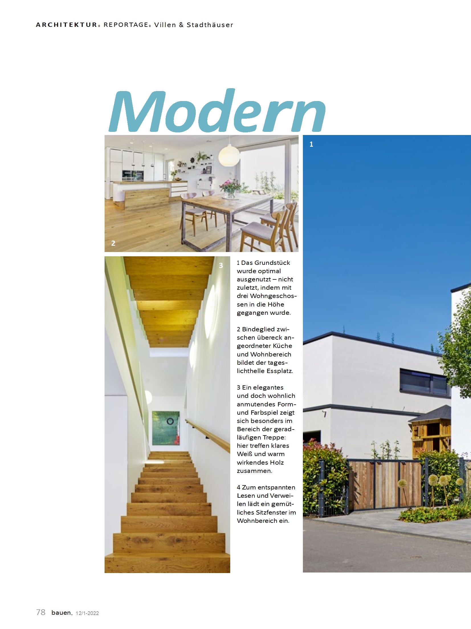 Der Artikel beschreibt eine moderne Stadtvilla mit Bauhaus-Design, die durch geschickte Planung und drei Geschosse viel Wohnfläche bietet. Im Erdgeschoss gibt es eine geräumige Diele, ein Duschbad, einen Hauswirtschaftsraum, eine offene Küche und einen großen Wohnbereich mit Zugang zur Terrasse. Im mittleren Geschoss befinden sich private Rückzugsräume und das Familienbad. Das dritte Geschoss bietet zusätzlichen Freiraum in Form eines Wohnstudios und einer Dachterrasse. Außerdem gibt es auf der Gartenseite weitere Terrassenflächen. Das Familienbad hat große Fenster und einen schönen Ausblick ins Grüne. Die Villa soll durch ihre klare, geradlinige Architektursprache eine zeitlose Ästhetik und Funktionalität vermitteln.
