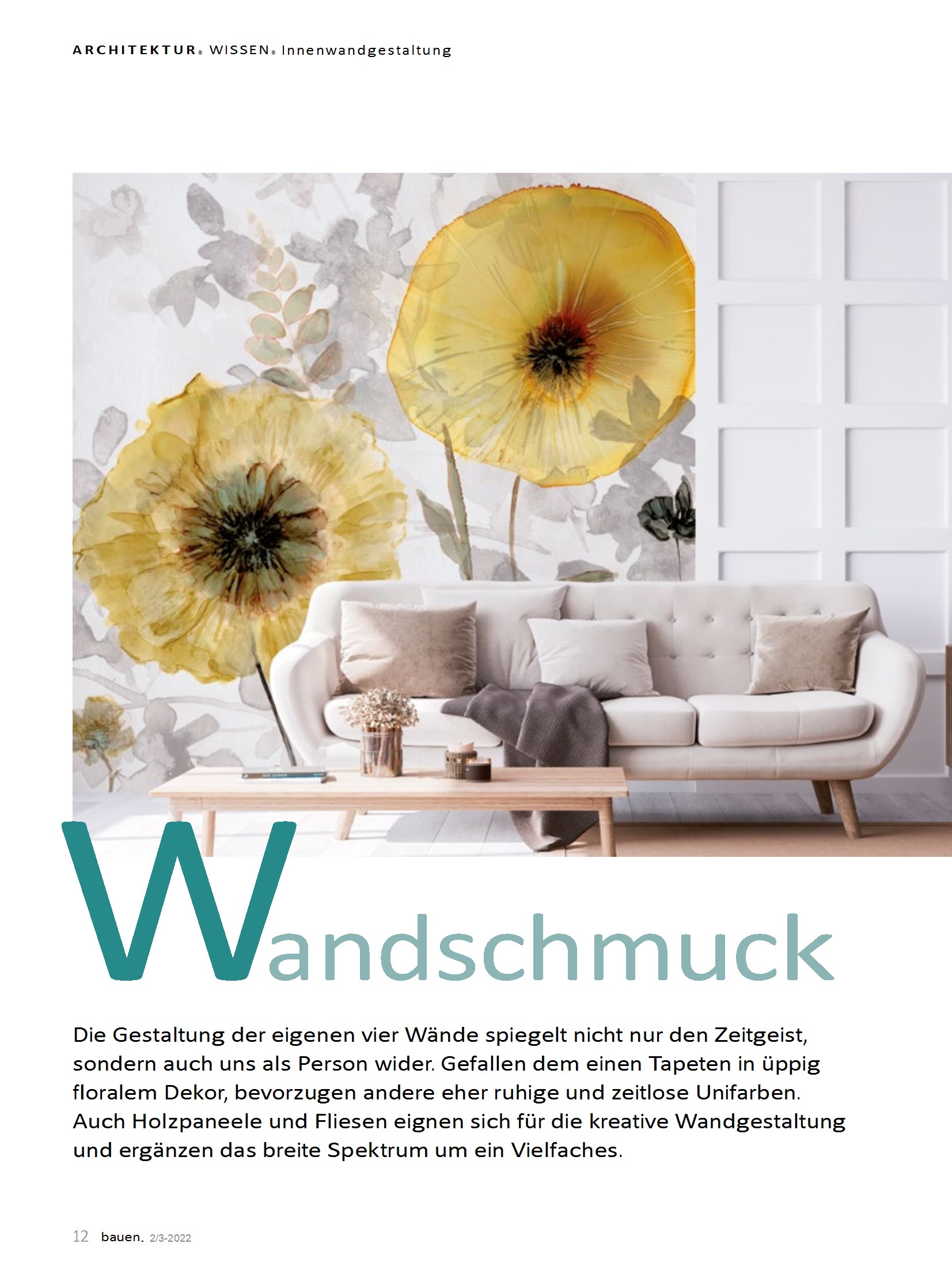 Der Artikel beschäftigt sich mit Möglichkeiten der Innenwandgestaltung. Es werden verschiedene Optionen vorgestellt wie Tapeten mit Blumenmustern oder ethnischen Motiven sowie Wandpaneele aus Holz in verschiedenen Ausführungen. Auch ultradünne und leichte Betonplatten sowie Fliesen in verschiedenen Designs werden als Wandbeläge vorgestellt. Der Artikel betont die Möglichkeit, mit Wandbelägen eine dekorative Wirkung zu erzielen und bei Bedarf auch einfach austauschen bzw. überstreichen zu können.